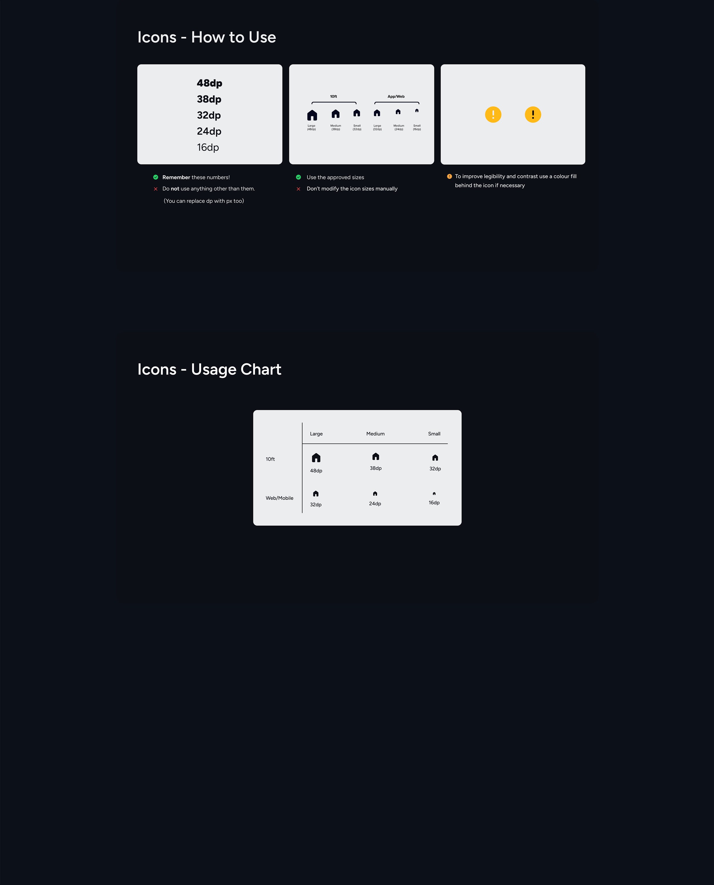 Typography scales, grid systems, and a robust spacing scale were defined to create a cohesive structure. To support seamless adoption, we incorporated the Material Icons set—a library of over 1,000 icons—giving designers, developers, and users a versatile and comprehensive resource.