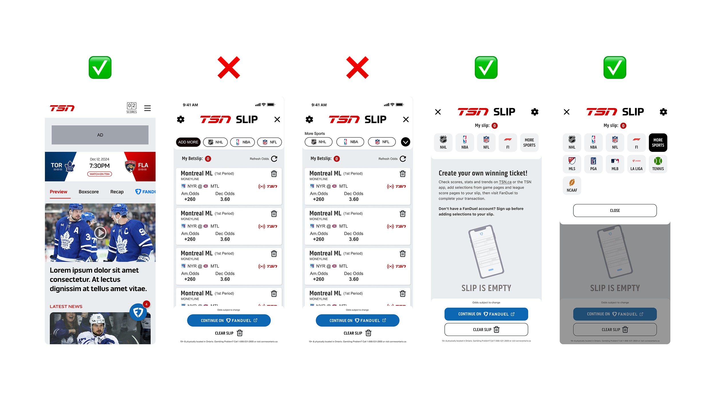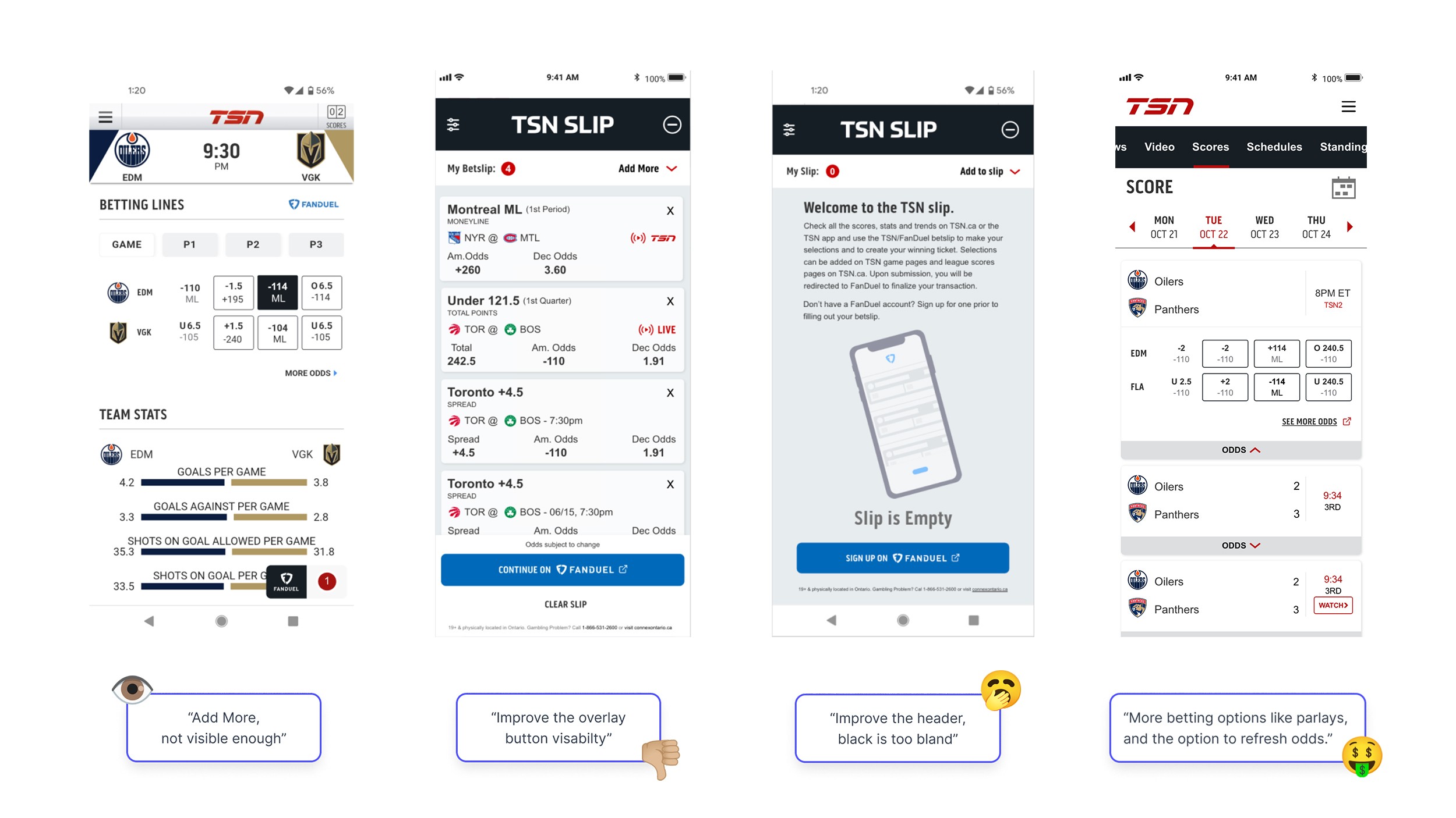 Adding league logos to the bet cards was a low-effort task, but it didn’t add much value. The cards already contain a lot of detail in a small space, and with team logos already included, league logos felt redundant and would only add clutter. The request to display payouts was a great idea in theory, but since the TSN platform functions as a bet builder rather than a betting platform, payouts are only relevant on FanDuel’s side. We also didn’t have the bandwidth to tackle this during this phase. Similarly, enabling users to perform all actions within the slip rather than navigating to game pages is a feature we’d love to implement in the future, but it wasn’t feasible to develop at this time.