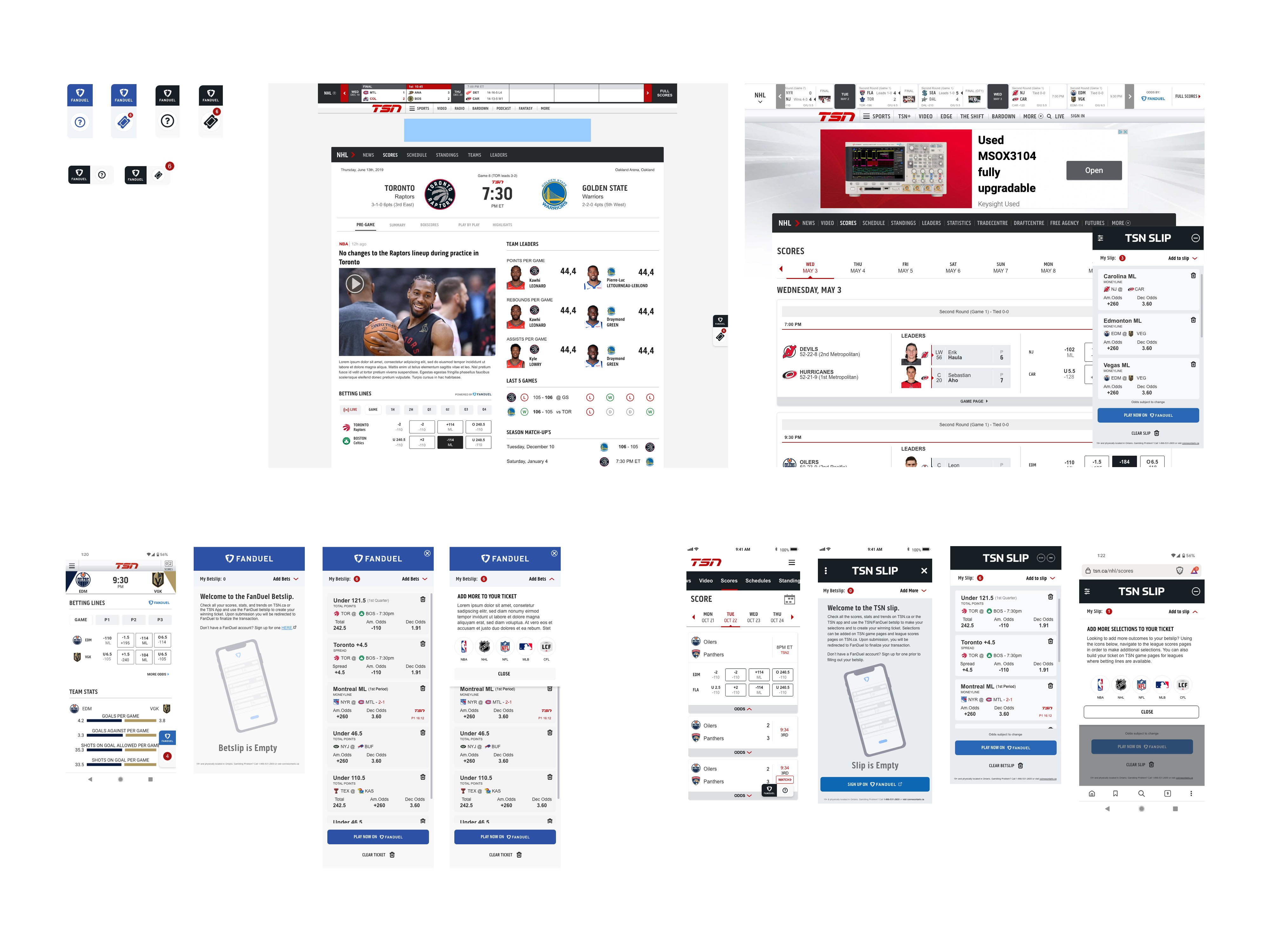 To ensure the success of the TSN x FanDuel integration, I began by aligning with stakeholders from both organizations to clarify goals, requirements, and constraints. This collaboration emphasized key objectives, such as enhancing user engagement while upholding responsible gambling practices. Next, I conducted comprehensive user research to understand TSN’s audience, exploring their familiarity with sports betting and identifying potential barriers or pain points. Methods such as user interviews, surveys, and competitive analysis revealed critical insights, including the need for quick access to real-time betting odds and features that complemented the sports-viewing experience. These findings shaped the problem definition and user goals, focusing on creating a seamless, intuitive, and trustworthy interface.