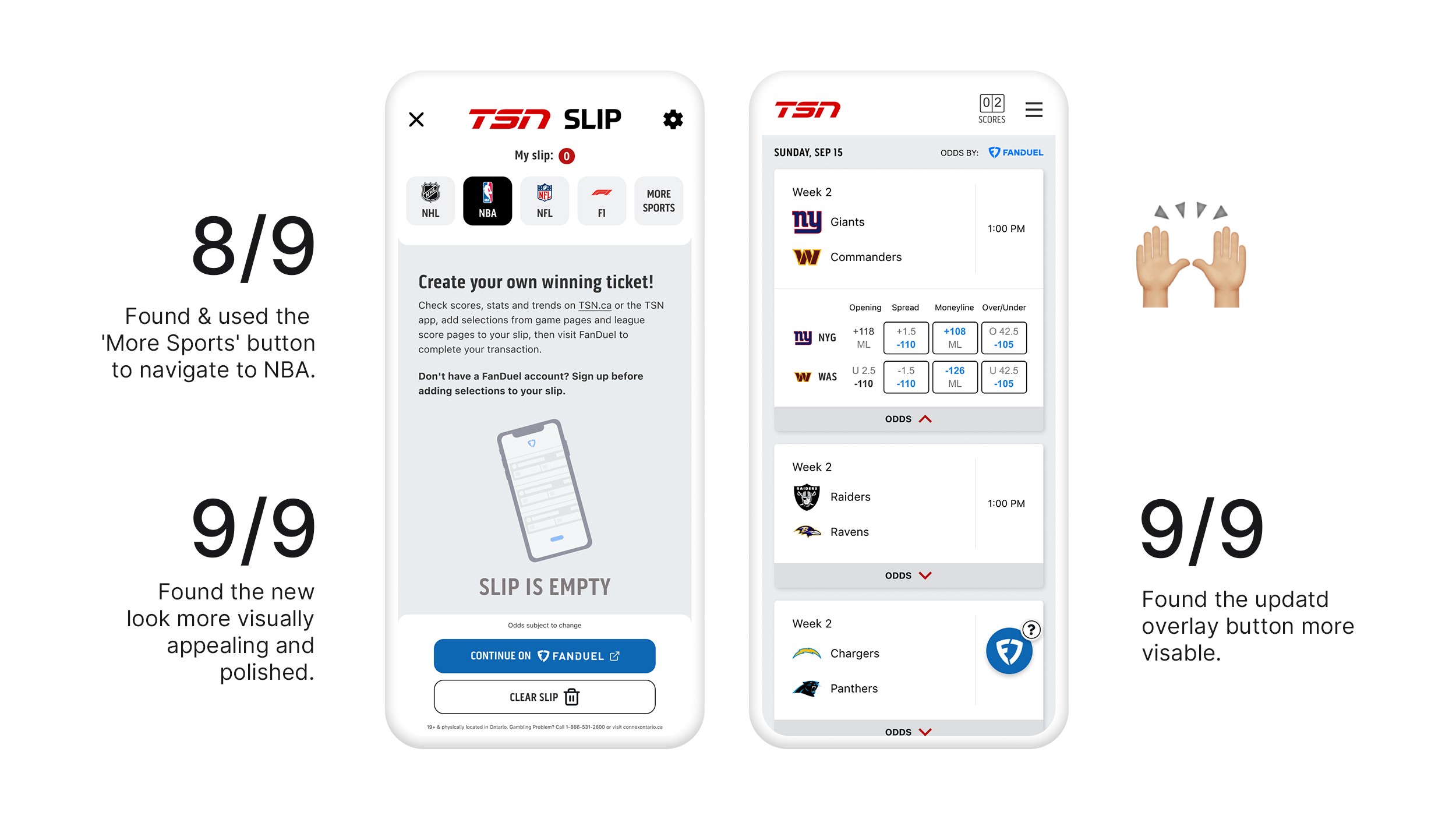 All nine participants found the new overlay button to be more visible and visually pleasing, appreciating its non-intrusive design. When tasked with using the updated "More Sports" drop-down, eight out of nine participants successfully navigated to the NBA, noting that the section was easy to access and a significant improvement in both usability and visual appeal. Additionally, all nine users praised the visual updates, describing them as polished, more engaging, and better aligned with the TSN brand.